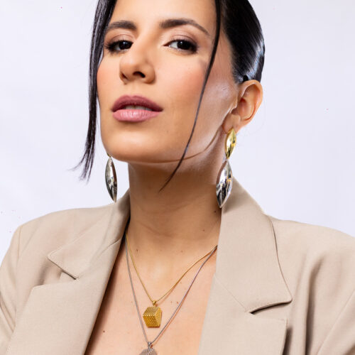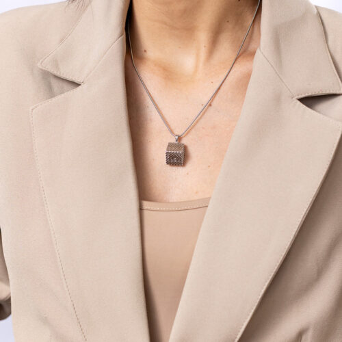 Colar curto no banho diamante com pingente em formato piramidal com textura reticulada vazada, design geométrico moderno e acabamento acetinado. Possui extensor de 10cm. *Consulte a aba “dicas de conservação” ou vide a etiqueta afixada ao produto para ciência sobre os cuidados com a peça.