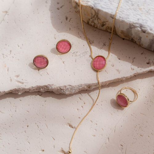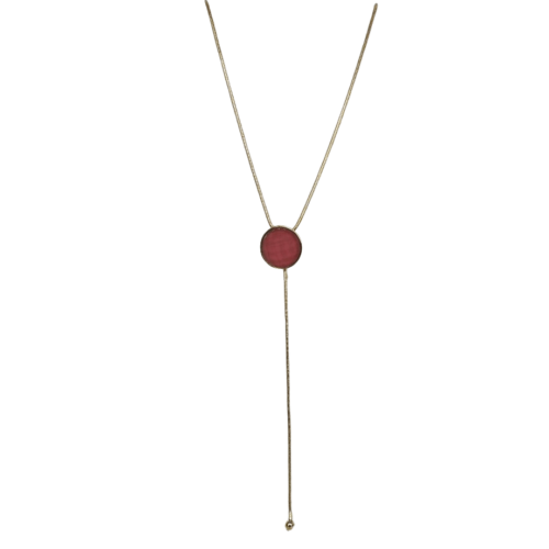 Colar médio estilo gravata, no banho de ouro e pedra de vidro rosa goiaba. Possui extensor de 10 cm. Consulte a aba “dicas de conservação” ou vide a etiqueta afixada ao produto para ciência sobre os cuidados com a peça.