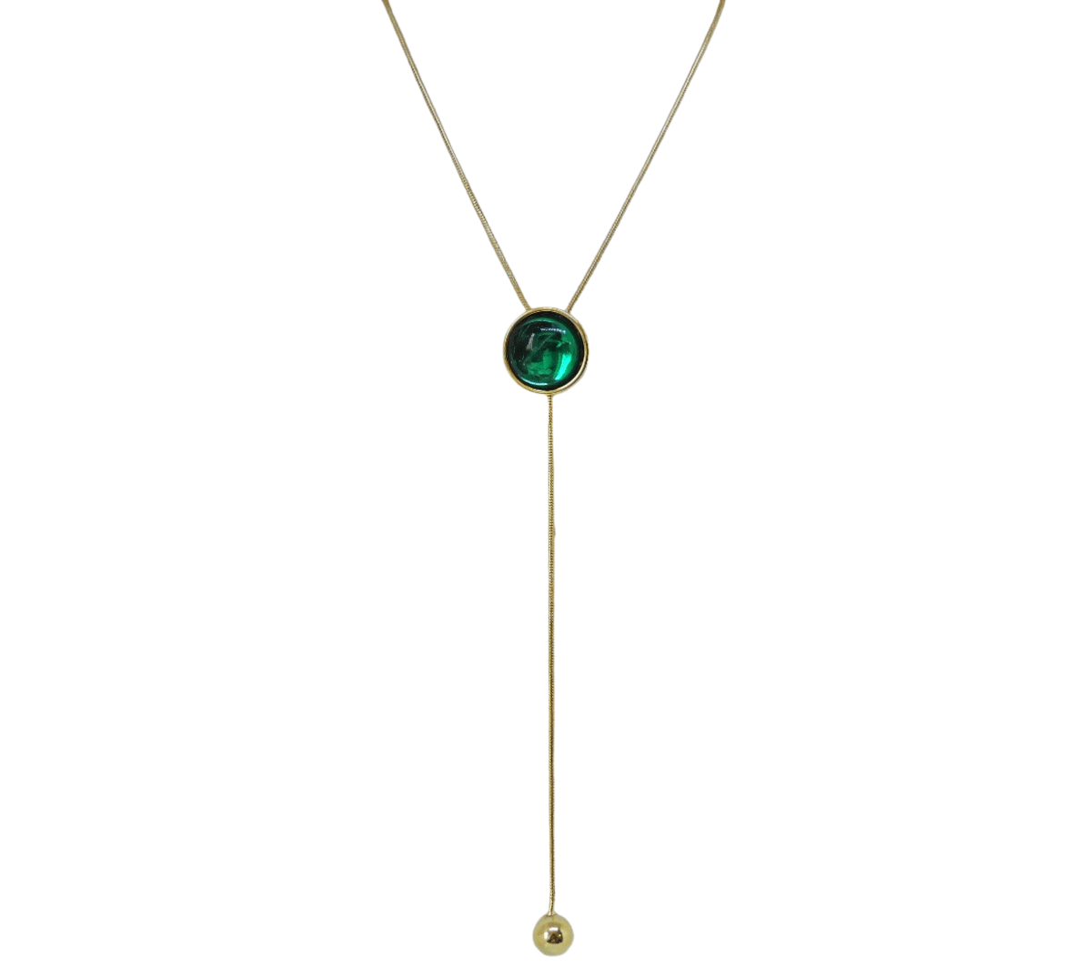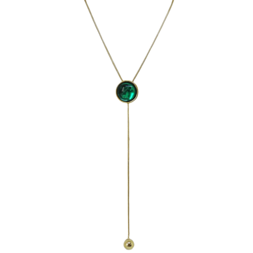 Colar médio estilo gravata, no banho de ouro e resina verde.