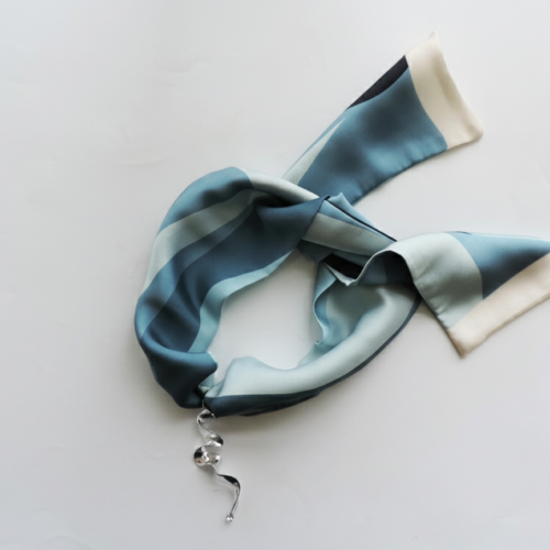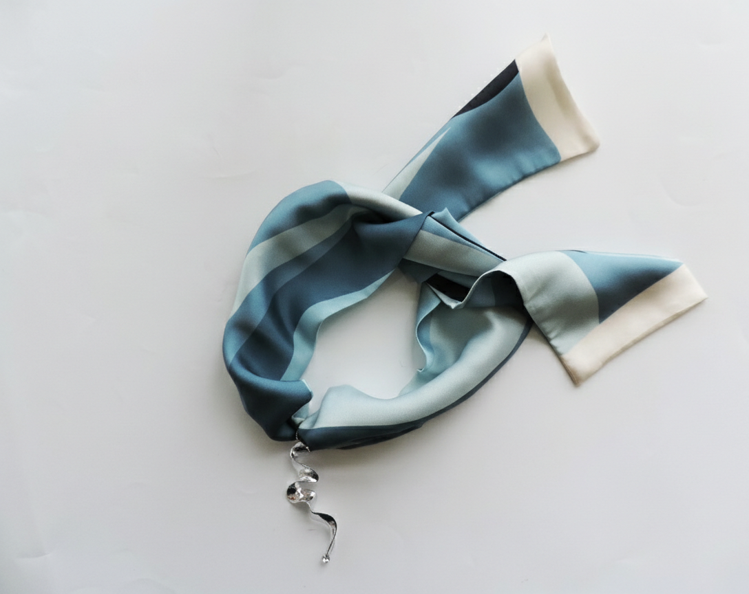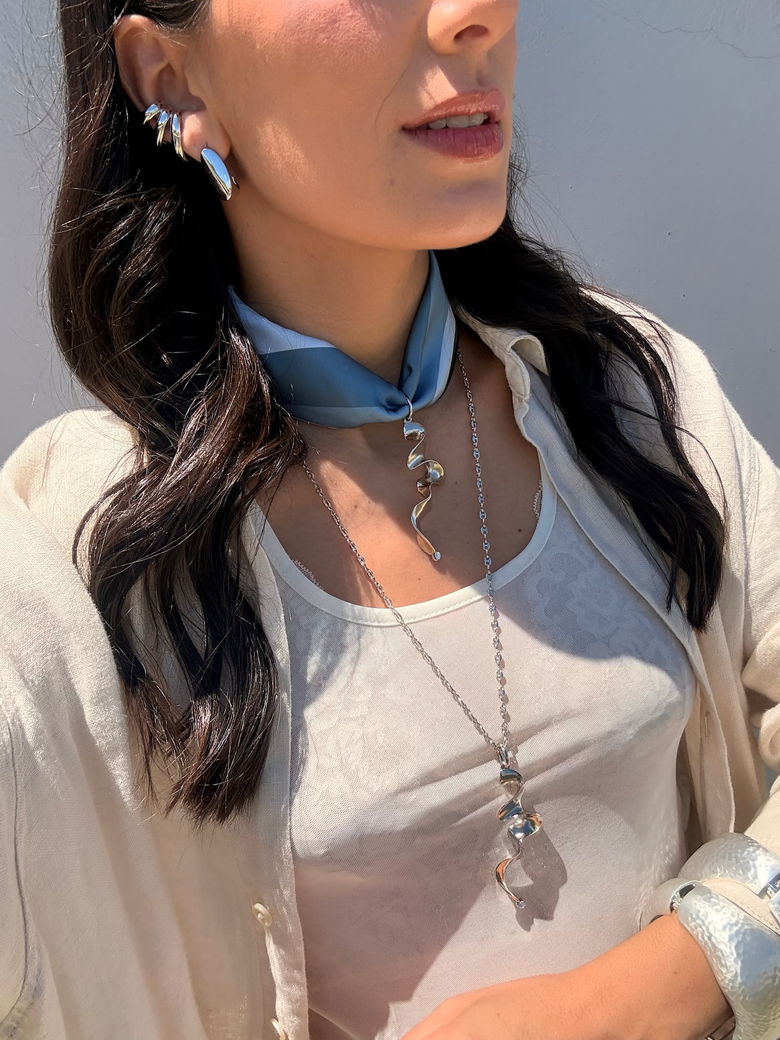 Colar multifuncional de lenço com estampa exclusiva desenvolvida na marca de cor azul e pingente grande de formato orgânico e espiral, no banho diamante com aplicação de strass na cor crystal. Feito no tecido com toque de seda, leve e versátil, oferecendo múltiplas formas de uso. É possível usá-lo como um elegante acessório para o pescoço, no cabelo para um toque de charme em seu penteado, no punho como uma pulseira ou até mesmo amarrações como um detalhe na bolsa, roupa e onde sua criatividade permitir. Sua estampa e seu design atemporal tornam esta peça especial para todas as estações. Comprimento total de 86cm.