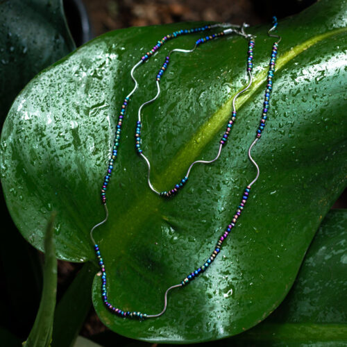 Colar curto com miçanga de vidro na cor preta com efeito irisado e tubos curvados no banho diamante. Possui extensor de 10cm. Consulte a aba “dicas de conservação” ou vide a etiqueta afixada ao produto para ciência sobre os cuidados com a peça.