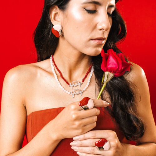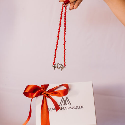 Colar curto com bolinhas de resina na cor vermelha e pingente de coração no banho diamante. Possui extensor de 10cm. *Consulte a aba “dicas de conservação” ou vide a etiqueta afixada ao produto para ciência sobre os cuidados com a peça.