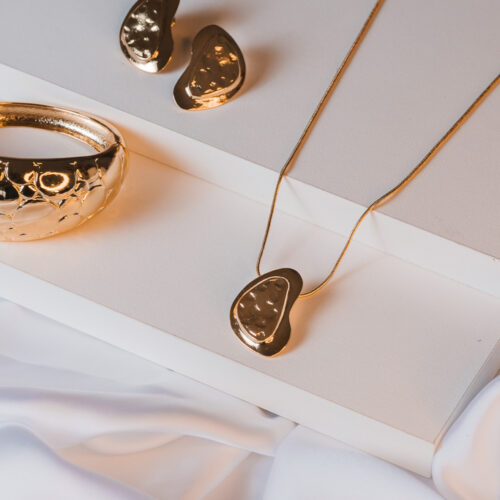 Voltar à LojaColar longo com pingente orgânico no banho de ouro.