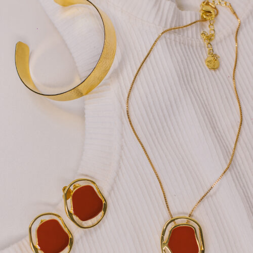 Colar curto com pingente orgânico no banho de ouro e esmaltação na cor caramelo. Possui extensor de 10cm. *Consulte a aba “dicas de conservação” ou vide a etiqueta afixada ao produto para ciência sobre os cuidados com a peça.