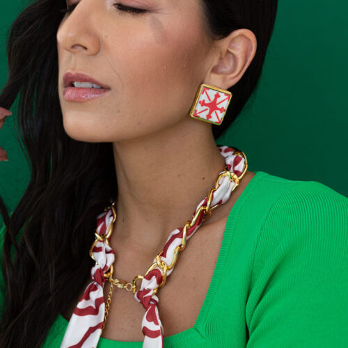 Voltar à LojaColar curto 2 em 1 com corrente em banho de ouro e lenço com estampa na cor vermelha.