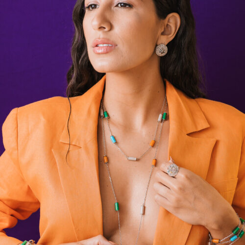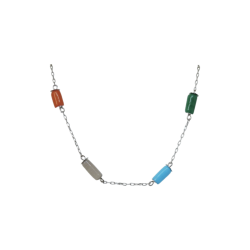 Colar curto no banho diamante com muranos de vidro nas cores azul, verde, laranja e branco. Possui extensor de 10cm. Consulte a aba “dicas de conservação” ou vide a etiqueta afixada ao produto para ciência sobre os cuidados com a peça.