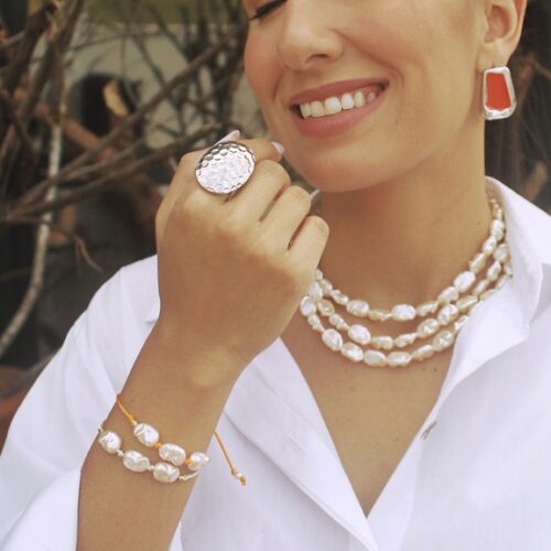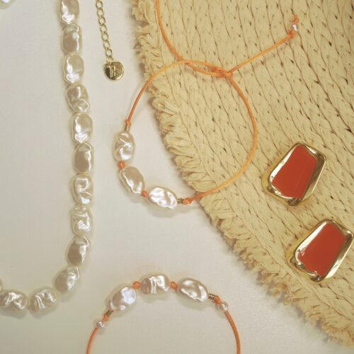 Combo composto por 1 Pulseira Horizonte (pulseira de amarração em fio de cetim na cor laranja, com pérolas e detalhes no banho de ouro) + 1 Argola Sucesso (argola pequena em resina transparente e detalhes na cor laranja, super leve.). *Consulte a aba “dicas de conservação” ou vide a etiqueta afixada ao produto para ciência sobre os cuidados com a peça.