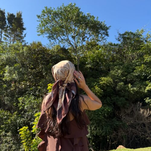 Lenço com estampa de guepardo e tons de marrom. Tecido 100% poliéster. Medida de 90×90 cm. *Consulte a aba “dicas de conservação” ou vide a etiqueta afixada ao produto para ciência sobre os cuidados com a peça.