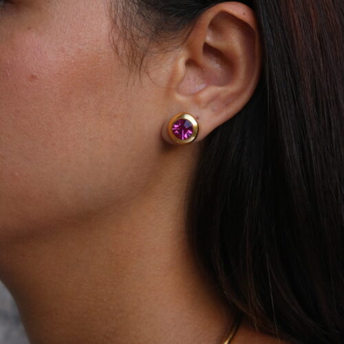 Brinco ponto de luz pequeno em banho de ouro e cristal rosa pink, super leve. *Consulte a aba “dicas de conservação” ou vide a etiqueta afixada ao produto para ciência sobre os cuidados com a peça.