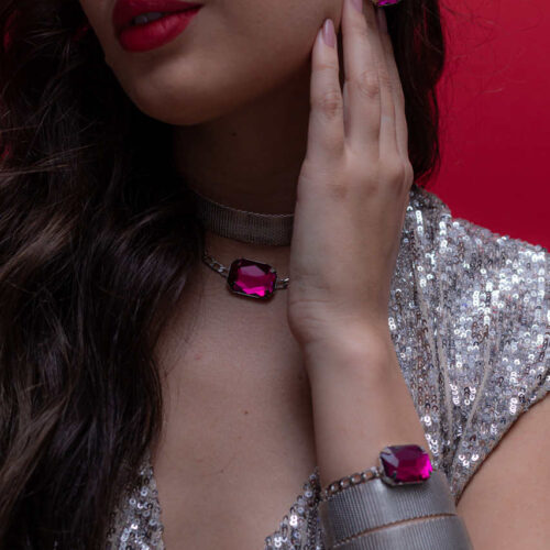 Voltar à LojaPulseira com resina rosa translucida no banho diamante.