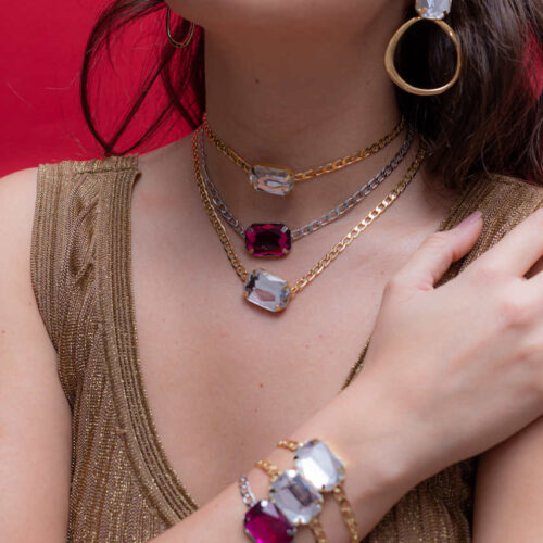 Pulseira com resina rosa translucida, no banho diamante. Extensor de 4cm. Consulte a aba “dicas de conservação” ou vide a etiqueta afixada ao produto para ciência sobre os cuidados com a peça.