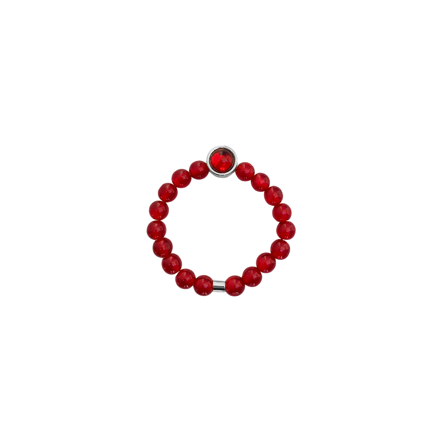 Pulseira com pingente de pedra de resina vermelha, bolas vermelhas e detalhes no banho diamante. *Consulte a aba “dicas de conservação” ou vide a etiqueta afixada ao produto para ciência sobre os cuidados com a peça.