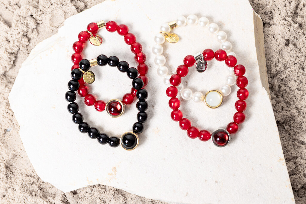 Pulseira com pingente de resina vermelho, detalhes no banho de diamante e bolas vermelhas.